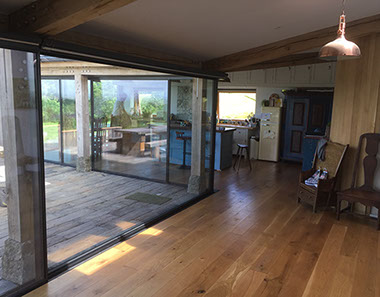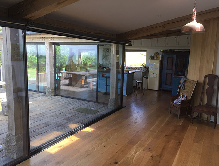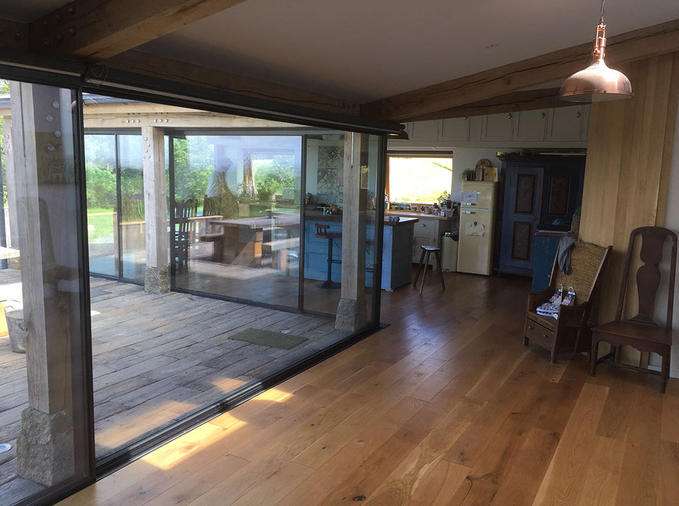 This bespoke self-build barn conversion utilised an oak stability frame with concealed stainless steel bolted connections to form an L-shaped structure almost entirely glazed on two sides.
