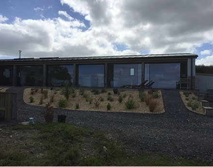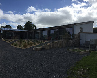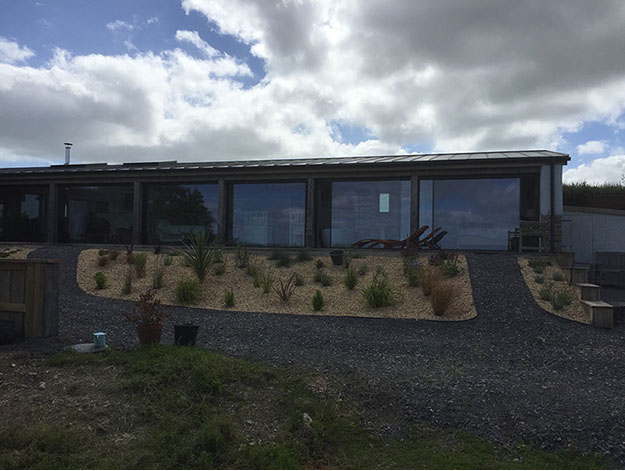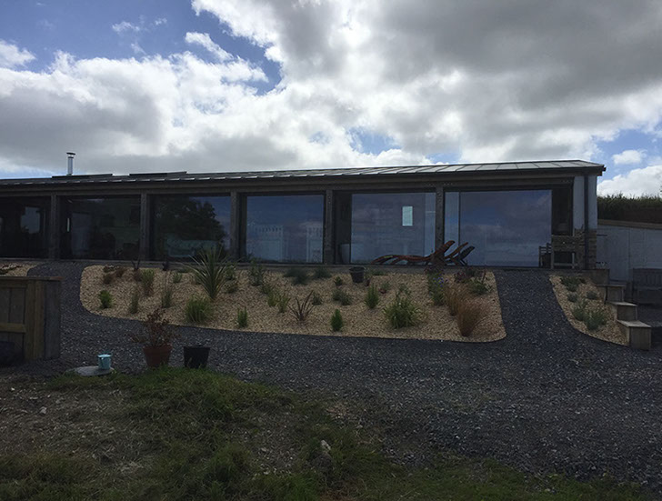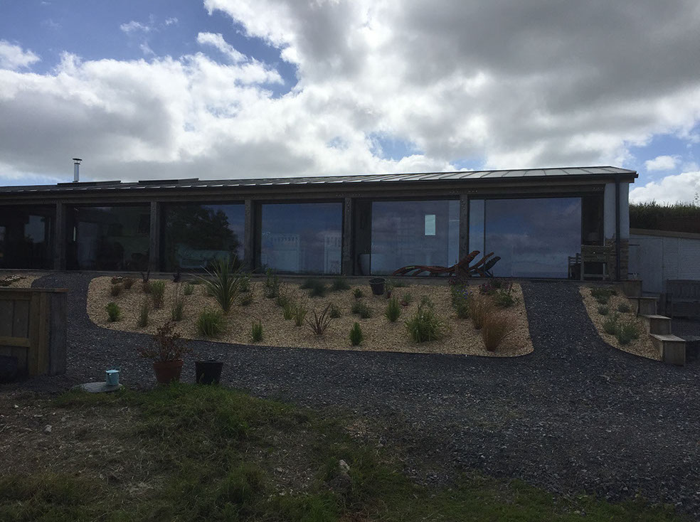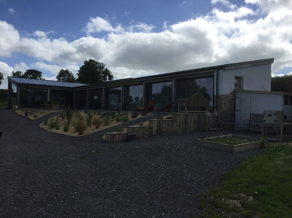 The result was a pleasing combination of traditional oak posts, staddle stones, cob walls and timber cladding with a not-so-subtle modern twist provided by the large panel glazing, zinc monopitch roof and stainless steel bolted connections.